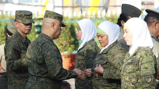 Anggota unit tentara berhijab, terdiri dari empat perwira dan 56 tamtama, dianugerahi Medali Merit Militer untuk layanan mereka di Marawi pada 2017.
