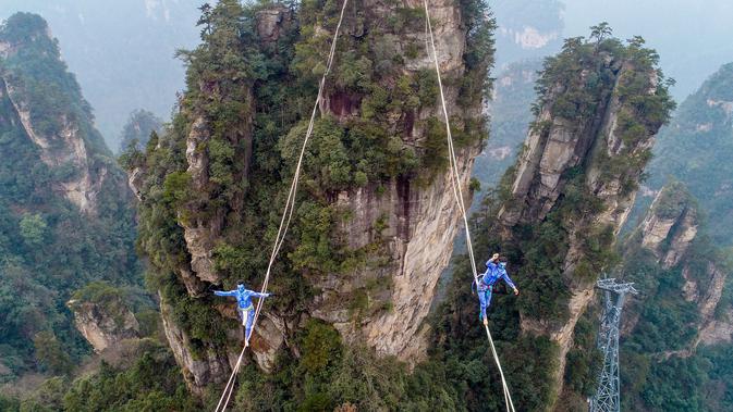 Kontestan berpakaian karakter Avatar bergaya saat melintasi slackline di Pegunungan Huangshizhai di Zhangjiajie, Hunan, China, Minggu (23/12). Pemandangan tersebut memberi sensasi bukit-bukit yang melayang, persis di film Avatar. (STR/AFP)