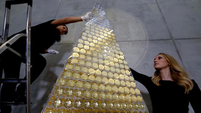 Karyawan rumah emas ProAurum menyusun koin emas yang disebut sebagai pohon Natal di Munich, Jerman, 3 Desember 2018. Pohon Natal ini terbuat dari 2.018 koin emas filharmonik wina senilai 2.3 euro atau sekitar 370 milliar rupiah. (AP/Matthias Schrader)