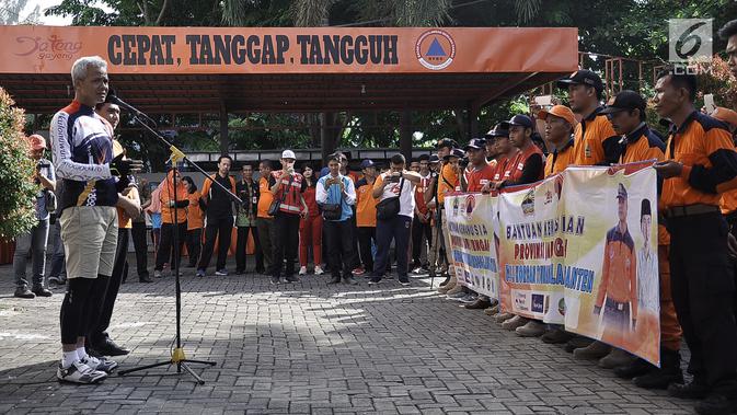 Gubernur Jawa Tengah Ganjar Pranowo mengecek bantuan logistik menuju Provinsi Banten yang terdampak tsunami Selat Sunda di Kantor BPBD, Semarang, Jumat (28/12). BPBD Jateng memberangkatkan 49 personel, sarana dan bantuan logistik. (Liputan6.com/Gholib)