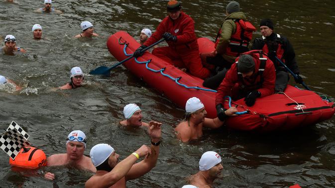 Orang-orang keluar dari sungai Vltava setelah mengikuti kompetisi berenang Natal tahunan, di ibu kota Republik ceko, Praha, Rabu (26/12). Dalam menyemarakkan Natal, mereka mengikuti lomba renang di sungai bersuhu dingin. (Michal CIZEK / AFP)