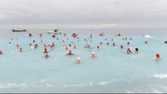 Walikota Nice, Christian Estrosi (tengah) berpose dengan mereka yang ambil bagian dalam mandi natal di Nice, Prancis, Minggu (16/12). Kegiatan ini merupakan bagian dari perayaan tradisional Natal bagi warga Prancis. (Photo by YANN COATSALIOU / AFP)