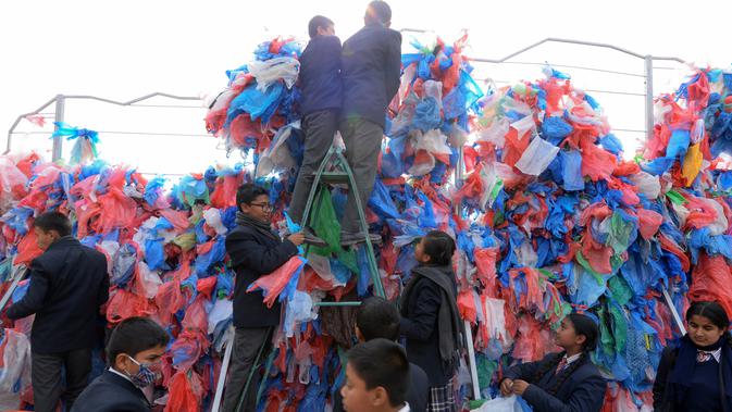 Relawan Nepal dan siswa sekolah membuat replika Laut Mati dari plastik daur ulang di Kathmandu pada 5 Desember 2018. Sebanyak 100.000 kantong plastik diikat di atas kisi besi dengan lebar 20 meter dan tinggi 5 meter. (PRAKASH MATHEMA / AFP)