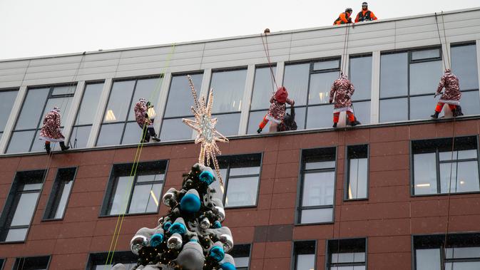 Pekerja layanan darurat mengenakan kostum Ded Moroz (Sinterklas Rusia) bergelantungan untuk menyapa para pasien di jendela rumah sakit anak-anak di Moskow, Kamis (27/12). Aksi tersebut untuk menyambut Tahun Baru mendatang. (AP/Alexander Zemlianichenko)