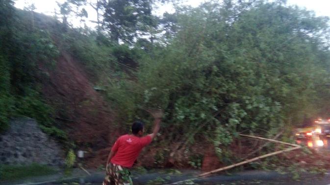 Liputan6.com, Garut - Longsor yang turun di sekitar Kampung Pangkalan Desa Sukaratu Kecamatan malangbong, Garut, Jawa Barat mengganggu arus lalu lintas di perlintasan jalur nasional Malangbong-Bandung dan sebaliknya hari ini, Selasa (25/12/2018). Beruntung musibah itu tidak meninmbulkan korban jiwa.