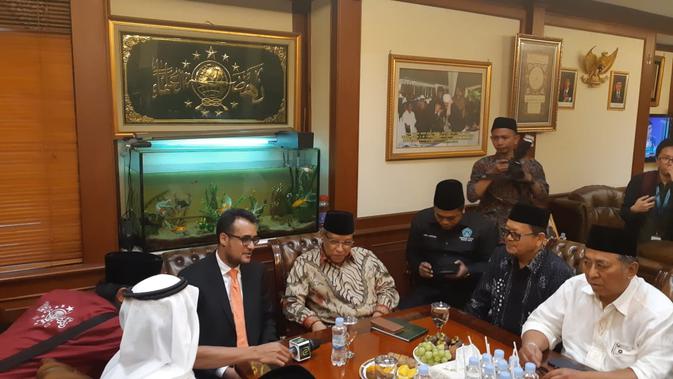 Liputan6.com, Jakarta - Duta Besar de facto Arab Saudi untuk RI, Yahya Hassan al-Qahtani melawat ke Kantor Pengurus Besar Nahdlatul Ulama (PBNU), Jakarta, Kamis 3 Januari 2019. Ia diterima langsung oleh Ketua Umum PBNU Said Aqil Siradj.