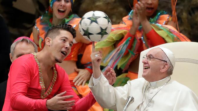 Paus Fransiskus memutar bola di jari saat kelompok sirkus Kuba tampil dalam audiensi umum mingguan di Vatikan, Rabu (2/1). from Berita Internasional, Sains, Feature, Kisah Inspiratif, Unik, dan Menarik Liputan6 kalo berita gak lengkap buka link di samping http://bit.ly/2SxSGf5