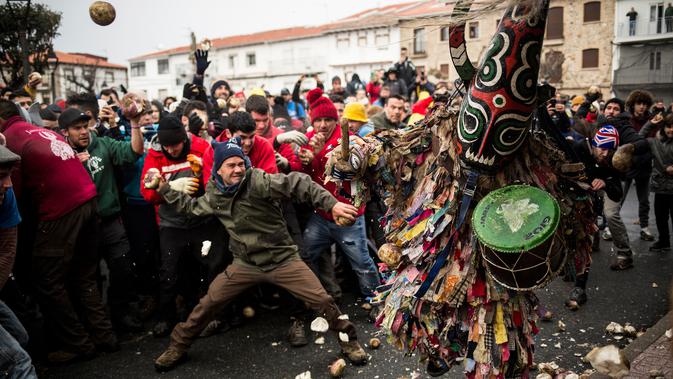 Orang-orang melempari seorang pria berkostum ala setan dengan sayuran lobak selama Festival Jarramplas di kota Piornal, Spanyol, Sabtu (19/1). Di beberapa kesempatan, Jarramplas berhenti agar warga bisa melempari lobak ke arahnya. (AP/Javier Fergo)