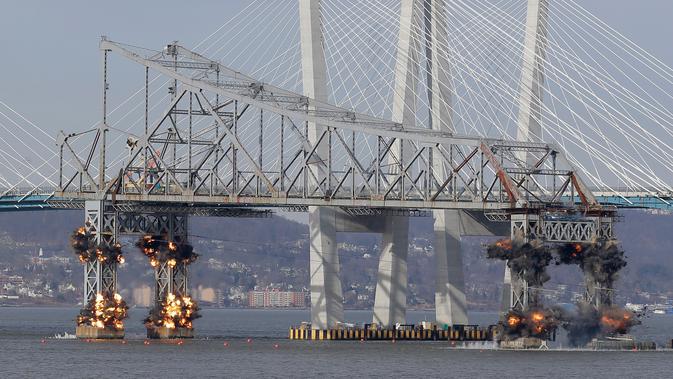 Bagian Jembatan Tappan Zee jatuh ke Sungai Hudson usai dihancurkan dengan ledakan dahsyat di Tarrytown, New York, AS, Selasa (15/1). Proses pembersihan Jembatan Tappan Zee yang hancur akan diangkut menggunakan kapal. (AP Photo/Seth Wenig)