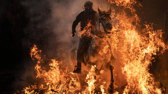 Seorang pria menunggangi kuda melewati api unggun saat festival Luminarias di San Bartolome de Pinares, Spanyol, Rabu (16/1). Festival ini digelar setiap tahunnya, sehari sebelum perayaan Santo Antonius yang merupakan pelindung binatang. (AP/Felipe Dana)