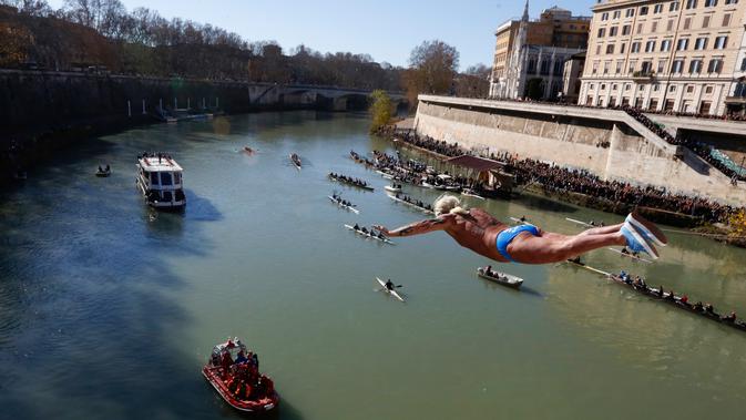Marco Fois dari Italia melakukan terjun bebas ke sungai Tiber dari Jembatan Cavour di Roma, Selasa (1/1). Tradisi melompat dari jembatan setinggi 18 meter dan menyelam ke sungai tersebut sebagai bentuk perayaan tahun baru. (AP/Riccardo De Luca)