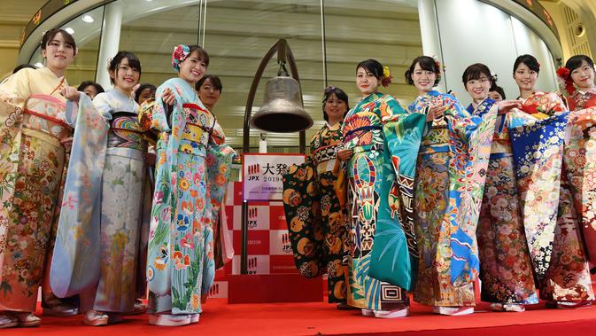 Sejumlah gadis cantik berbaju Kimono meramaikan pembukaan Bursa Efek Tokyo di Tokyo, Jepang, Jumat (4/1). from Berita Internasional, Sains, Feature, Kisah Inspiratif, Unik, dan Menarik Liputan6 kalo berita gak lengkap buka link di samping http://bit.ly/2F5nxN9