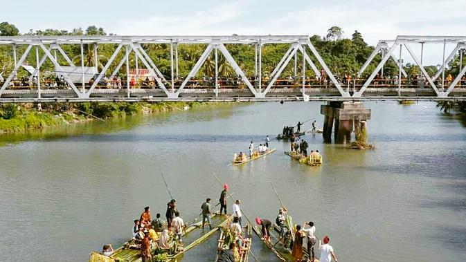 Konvoi rakit yang berhiaskan janur kuning ini mengundang perhatian warga yang melintas di atas jembatan Sungai Mandar di Tinambung, Kabupaten Polman. Tidak hanya itu, isi bawaan bahan baku makanan yang dikemas daun kelapa juga menarik perhatian warga, serta warganet yang melihat unggahan fotonya di media sosial.