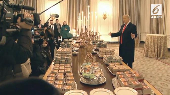 Liputan6.com, Jakarta Presiden Amerika Serikat, Donald Trump, sajikan makanan cepat saji kepada tim sepak bola Clemson University, selama perayaan kejuaraan nasional mereka di Gedung Putih.