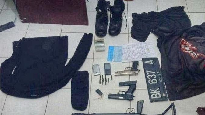 Selanjutnya, ada plat nomor polisi BK 637 A, surat kuasa utang piutang, sebo warna hitam, kaus lengan panjang hitam, kaus hitam lengan pendek, tas warna cokelat. Terakhir, dua pasang sandal warna hitam, satu stel sepatu PDL TNI, dan satu unit mobil yang dikendarai tersangka berplat BK 1236 QW.