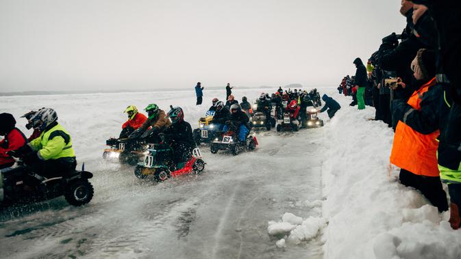 Tim Inggris, Toro Muerto mendahului tim Finlandia, Q-ryhma dalam kejuaran balap mesin potong rumput tahunan di Lavia, Finlandia, 9 Februari 2019. Di negara Finlandia, rumput tertutup salju selama berbulan-bulan dalam setahun. (Alessandro RAMPAZZO/AFP)