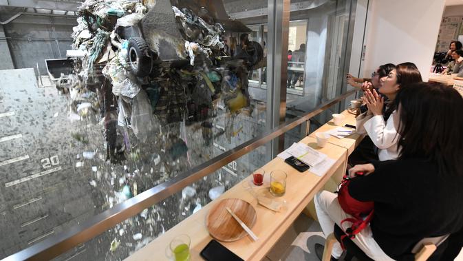 Pengunjung menikmati hidangan sambil melihat proses pengolahan sampah di Bar Gomi Pit, Tokyo, 18 Januari 2019. Beragam jenis sampah ada di sana, mulai dari tas belanja, pakaian bekas, barang-barang rumah tangga, hingga plastik. (Toshifumi KITAMURA / AFP)
