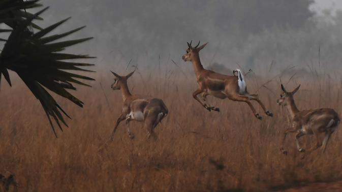 Dalam foto yang diambil pada 14 Desember 2018, kawanan blackbucks atau antelop India terlihat di sebuah ladang, negara bagian Odisha. Mamalia yang tersebar di Afrika, Asia, dan Timur Tengah ini termasuk hewan yang terancam punah. (Dibyangshu SARKAR/AFP)