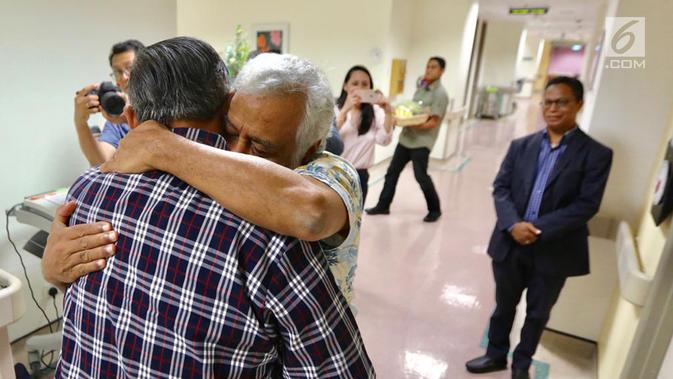 Mantan PM Timor Leste Xanana Gusmao memeluk Presiden RI ke-6 Susilo Bambang Yudhoyono (SBY) di National University Hospital, Singapura, Minggu (24/2). Xanana menjenguk istri SBY, Ani Yudhoyono yang sedang sakit. (Liputan6.com/HO/Anung Anandito)