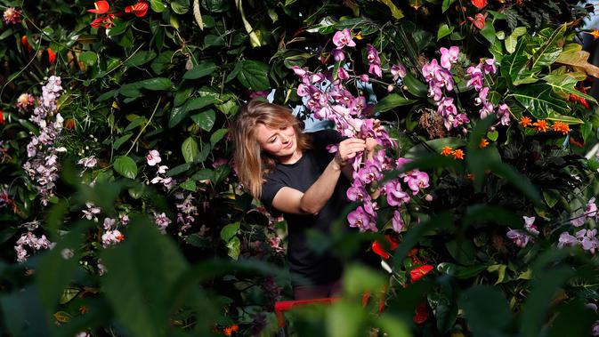 Tom Forshaw, seorang magang Hortikultura, menata tanaman anggrek selama pratinjau pers festival anggrek di Kew Gardens, London, Kamis (7/2). Festival yang memamerkan keanekaragaman hayati itu dibuka untuk umum mulai 9 Februari 2019. (AP/Alastair Grant)