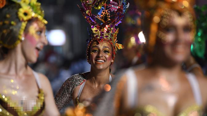 Anggota karnaval Uruguay, Comparsa, melakukan pertunjukkan tari selama parade karnaval Llamadas di Montevideo, Kamis (7/2). Para penari dengan menggunakan berbagai kostum menarik meriahkan parade tersebut di jalanan Montevideo. (PABLO PORCIUNCULA/AFP)