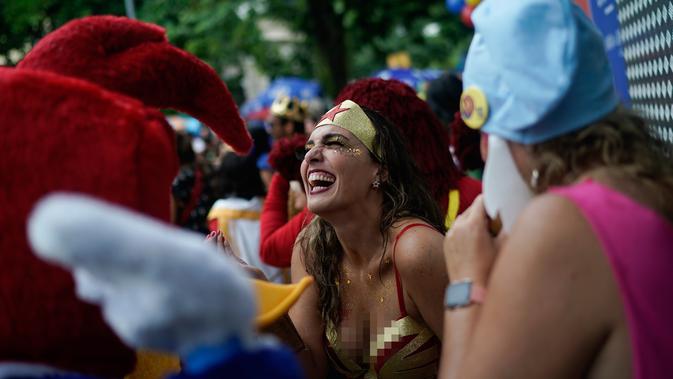 Peserta dengan kostum memeriahkan pesta blok tahunan `Desliga da Justica` di jalanan Rio de Janeiro, Brasil, 16 Februari 2019. Desliga yang berasal dari bahasa portugis adalah pesta jalanan yang membuat parodi "League of Justice". (AP/Leo Correa)