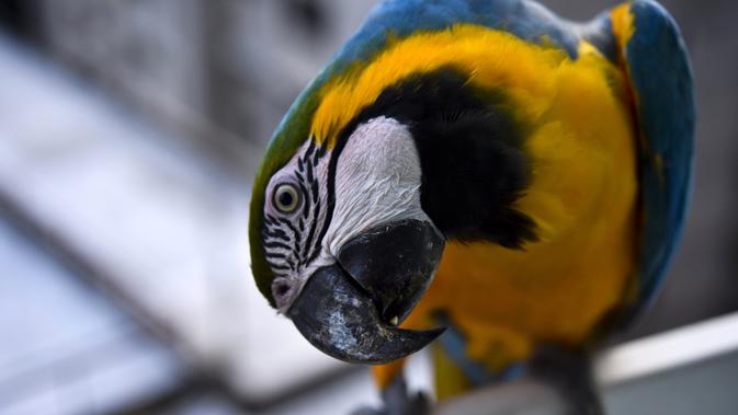 Sekawanan burung macaw (sejenis beo) berada di balkon sebuah gedung apartemen di Caracas pada 18 November 2018. Setiap sore, puluhan macaw liar berwarna-warni berduyun-duyun ke balkon dan teras tempat warga menaruh makanan untuk mereka. (YURI CORTEZ/AFP)