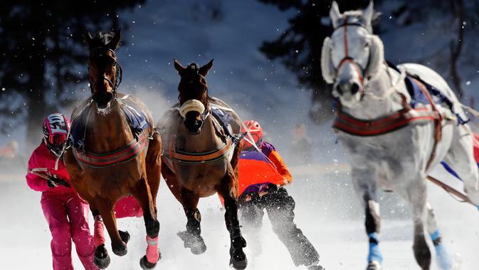 Para peserta ditarik oleh kuda mereka saat lomba Skijoring selama pacuan kuda White Turf di danau beku, Saint Moritz, Swiss, 17 Februari 2019. Skijoring mengharuskan kuda-kuda peserta menarik pemain ski di atas lintasan. (STEFAN WERMUTH / AFP)