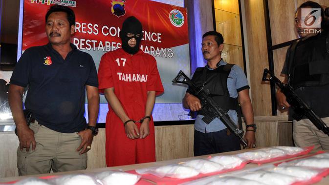 Tersangka kurir narkoba digiring aparat kepolisian pada rilis narkoba di Patwal Simpanglima Semarang, Minggu ( 17/3). Unit Satuan Narkoba Polsek Pedurungan Semarang menangkap kurir narkoba dengan barang bukti 1,3 kg sabu-sabu. (Liputan6.com/Gholib)