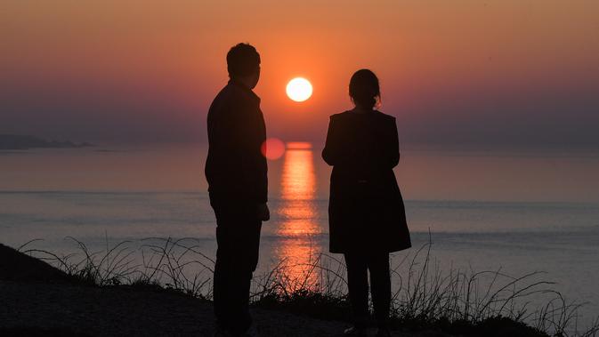 Pasangan berciuman saat matahari terbenam di Cap Frehel, di Plevenon, Prancis barat (26/2). Cap Frehel terletak 8,5 km dari pusat kota Fréhel, meskipun, secara administratif, terletak di dalam wilayah komune Plévenon. (AFP Photo/Loic Venance)