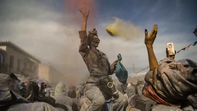 Peserta melemparkan tepung berwarna dalam perang tepung selama perayaan 'Ash Monday' di pelabuhan Galaxidi, Yunani, 11 Maret 2019. Mereka berlomba saling lempar mengenai orang-orang di sekitarnya dengan tepung, sebanyak mungkin. (ARIS MESSINIS/AFP)