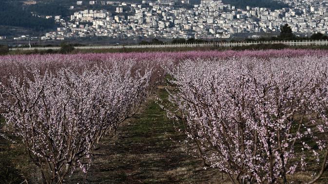 Petani beraktivitas dekat pohon persik yang berbunga di sebelah kota Veria, Yunani utara, pada 19 Maret 2019. Mekarnya bunga persik menjadi fenomena tahunan di pedesaan Yunani, yang menyerupai mekarnya bunga sakura di Jepang. (Sakis MITROLIDIS / AFP)