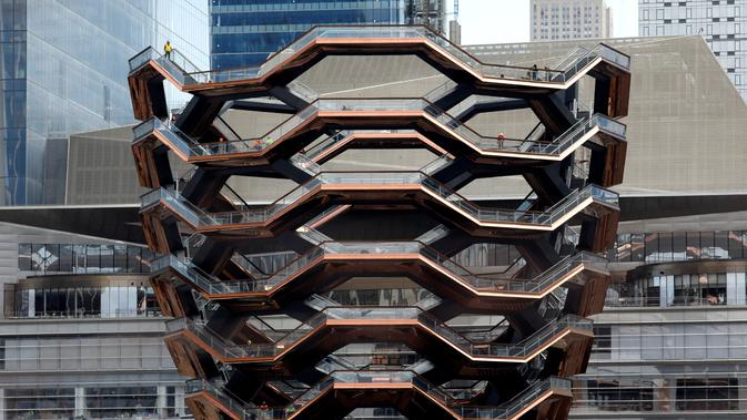 Konstruksi bangunan Vessel di proyek pembangunan Hudson Yards, Manhattan West Side, New York, AS, Selasa (12/3). Menurut desainer Thomas Heatherwick dari Heatherwick Studio, struktur bangunan terinspirasi dari sarang lebah. (REUTERS/Mike Segar)