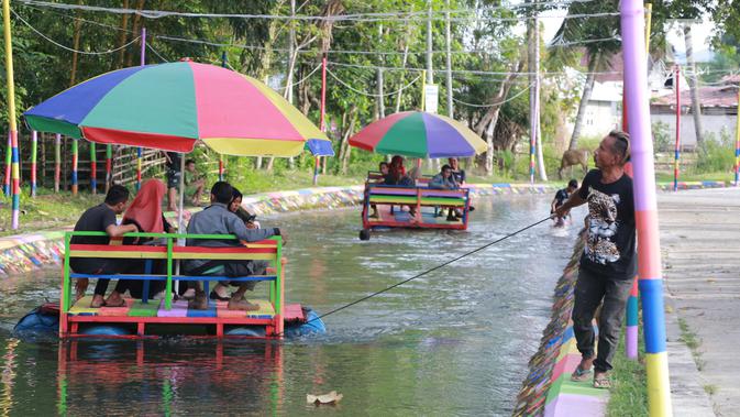 Warga melintasi perahu apung di Wisata Air Toino, Desa Talulobutu, Kecamatan Tapa, Kabupaten Bone Bolango, Gorontalo, Sabtu (30/3). Selain sebagai sosialisasi menjaga kebersihan lingkungan, wisata air ini juga sengaja dibuat agar bisa menarik perhatian. (Liputan6.com/Arfandi Ibrahim)