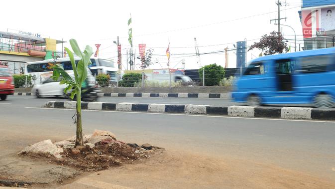 Kendaraan melintas dekat lubang bekas galian yang ditanami pohon pisang di Jalan Raya Margonda, Depok, Senin (4/3/2019). Aksi tanam pohon pisang itu sebagai protes warga akibat banyaknya lubang galian di Jalan Margonda. (Liputan6.com/Herman Zakharia)