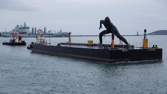 Patung perunggu terbesar di Inggris, berjudul 'Messenger' tiba dengan tongkang di pesisir pantai Plymouth, Senin (18/3). Nantinya patung dengan tingggi 7 meter itu bakal dipajang di depan gedung teater kota, Theatre Royal. (REUTERS/Peter Nicholls)