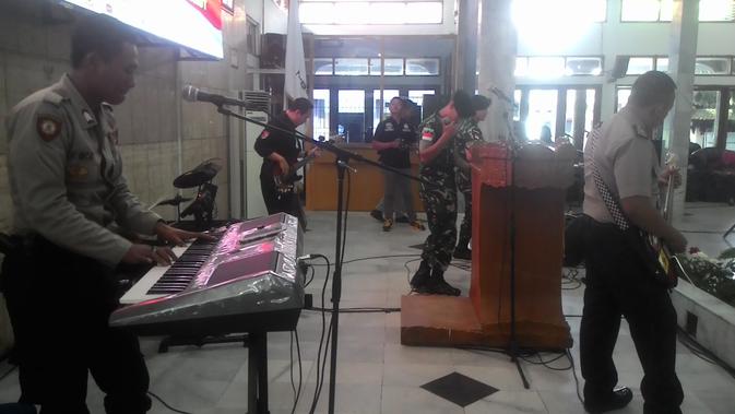 Liputan6.com, Garut - Ada pemandangan berbeda saat ' Deklarasi Pemilu Damai' seluruh caleg, partai politik (Parpol) dan perwakilan lapisan masyarakat Garut, Jawa Barat yang dilakukan di Pendopo Garut, siang tadi. Lima personil gabungan anggota TNI-Polres [Garut] (3917183 ""), nampak lihai dan selaras memainkan alat musik band, untuk peserta senang membuka pengumuman yang hadir.