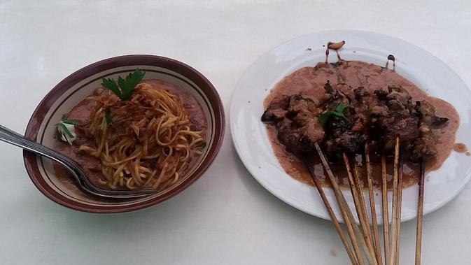 Pagi menjelang siang itu, sejumlah karyawan warung Mi Ongklok Pak Tugi mempersiapkan segala sesuatu. Ada yang merebus mi, memasak kuah kental, hingga menyindik daging sapi yang merupakan kekhasan lain mi Ongklok.