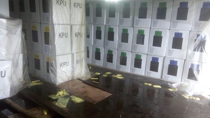 Sementara di sekitar tumpukan kotak suara, yang dekat dengan titik bocornya atap di gedung tempat penyimpanan logistik, masih terlihat genangan air. Namun kotak suara, yang terbuat dari karton tersebut, sudah dilapisi plastik untuk menghindari percikan air.