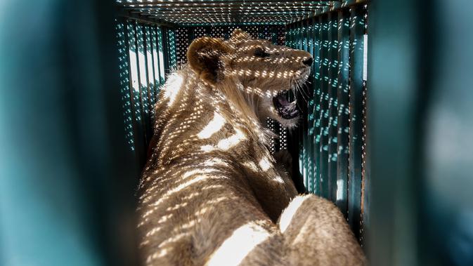 Amir Khalil, seorang dokter hewan dan organisasi kesejahteraan hewan internasional Four Paws mengevakuasi hewan dari kebun binatang di Rafah, Jalur Gaza, Palestina, Minggu (7/4). Pemilik kebun binatang mengatakan buruknya ekonomi dan blokade Israel membuatnya tak mampu merawat. (SAID KHATIB/AFP)