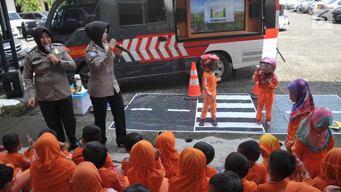 Polisi wanita (polwan) mengajarkan tertib lalu-lintas kepada anak-anak TK ABA Uswatun Hasanah Tembalang saat kunjungan ke Polrestabes Semarang, Selasa (9/4). Acara ini wujud nyata kepedulian Polri kepada masyarakat khususnya anak-anak. (Liputan6.com/Gholib)