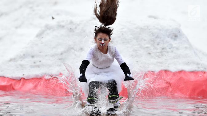 Seorang peserta melompat ke dalam kolam es sebagai bagian dari kompetisi komik 'Californication 9.0' di kota Logoisk, utara Minsk, Belarus, 7 April 2019. Sebanyak 8 peserta dengan kostum unik berseluncur salju untuk merayakan akhir musim dingin. (AP Photo/Sergei Grits)