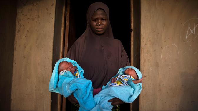 Suliat Ogunjimi menggendong bayi kembar tidak identik, Afusat Ganiyu dan Ganiyatu Adesope di Igbo Ora, Negara Bagian Oyo, Nigeria pada 3 April 2019. Saking banyaknya anak kembar yang dilahirkan, Igbo Ora dijuluki sebagai "ibu kota kembar dunia". (REUTERS/Afolabi Sotunde)