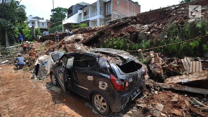 Sebuah mobil rusak setelah tertimpa material longsor tembok perumahan Lereng Indah di Perumahan Lereng Bukit Indah, Pondok Cabe Udik, Pamulang,Tangerang Selatan, Senin (8/4). Tembok perumahan sepanjang 25 meter dan tinggi enam meter itu longsor kemarin sore, Minggu (7/4). (merdeka.com/Arie Basuki)