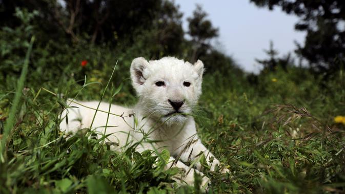 Seekor singa putih yang baru lahir, bernama Simba, terlihat di kebun binatang Paphos, Siprus pada 14 April 2019. Populasi satwa nokturnal tersebut terbilang langka di dunia, tercatat singa putih hanya ada 300 ekor dan 13 diantaranya hidup di alam liar. (REUTERS/Yiannis Kourtoglou)