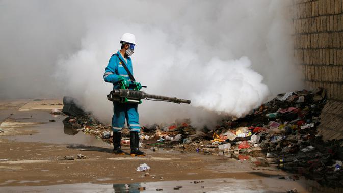 Pekerja menyemprotkan pestisida untuk membasmi wabah kolera di kawasan Sanaa, Yaman. Penyakit ini menyebar seperti kebakaran liar, menurut PBB yang mencatat 110.000 kasus kolera dan 200 kematian dalam tiga bulan. (REUTERS/Mohamed al-Sayaghi)