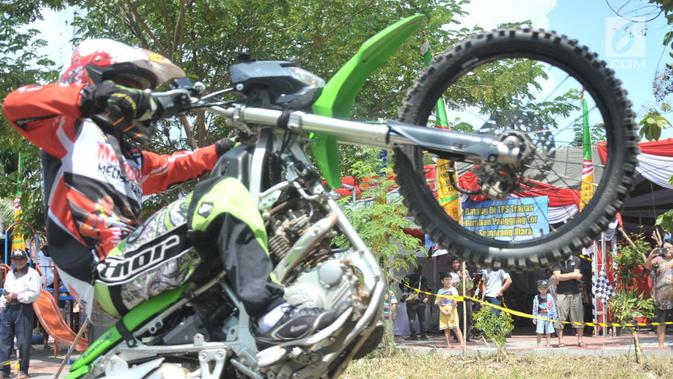 Warga menyaksikan para trabas-er balapan di TPS 6 Kelurahan Panggung Lor, Kota Semarang, Rabu (17/4). TPS tersebut mengangkat tema trail trabas agar menghibur warga dengan aksi balapan saat melakukan hak pilih di pemilu 2019. (Liputan6.com/Gholib)