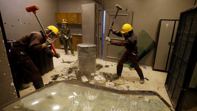 Warga Yordania menghancurkan kaca dan komputer dengan palu saat melampiaskan kemarahannya di AXE Rage Room di Amman, Yordania (17/4). Mereka diwajibkan harus mengenakan pakaian, sarung tangan dan helm khusus yang telah disediakan pihak penyelenggara. (Reuters/Muhammad Hamed)