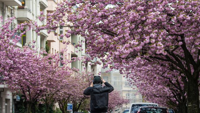 Seorang pria bersepeda sebuah jalan yang dipenuhi dengan bunga sakura yang mekar di kota Berlin, Jerman pada 23 April 2019. Pohon sakura di Jerman memang lazim ditanam di ruang-ruang terbuka hijau, selain sebagai peneduh juga untuk mempercantik kota. (John MACDOUGALL / AFP)