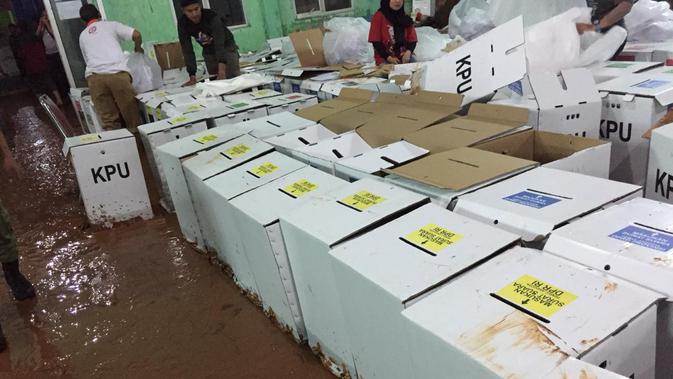 "Jadi benar pada saat petugas kami melakukan packing, kotak surat suara itu masih dalam gudang. Tiba-tiba ada angin puting beliung dan kemudian terjadi bah yang bercampur lumpur sehingga masuk ke dalam gudang," kata Nina saat ditemui di Kantor KPU Jabar, Senin (15/4/2019).